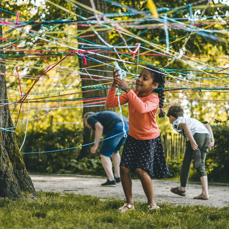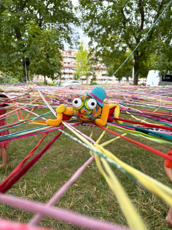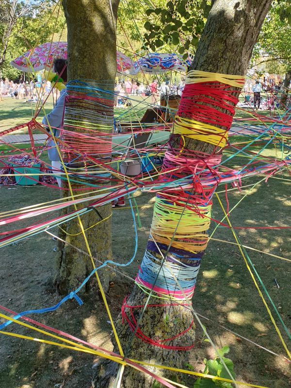 Action Weaving is het nieuwe haken. Met zijn allen maken we een enorm web van allerlei gekleurde, gerecyclede touwen. Alle kinderen krijgen bolletjes touw van telkens 10 meter.