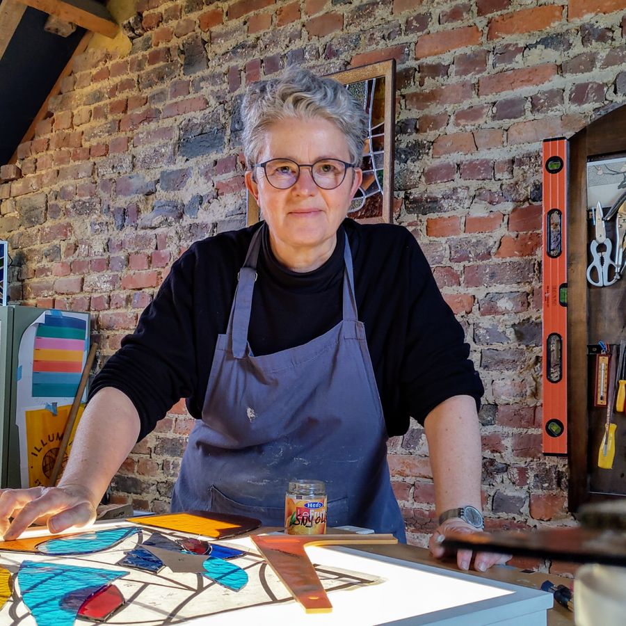 Glasraammaker Isabelle Decallonne, licht de geschiedenis van de glasraamkunst toe en demonstreert in haar pop-up atelier hoe vandaag een glasraam ambachtelijk vervaardigd wordt.