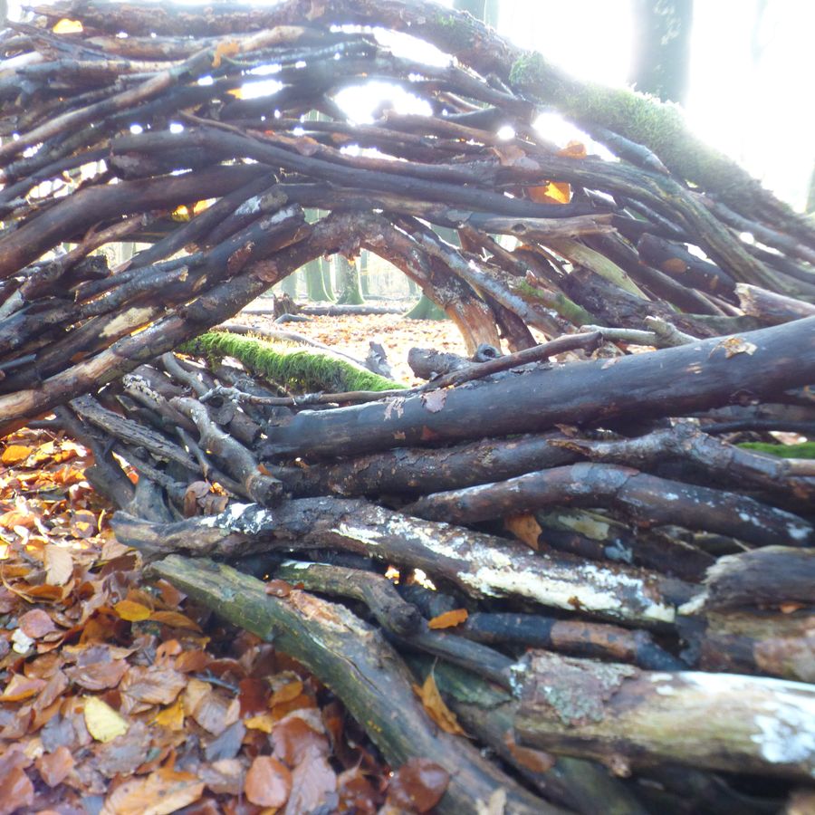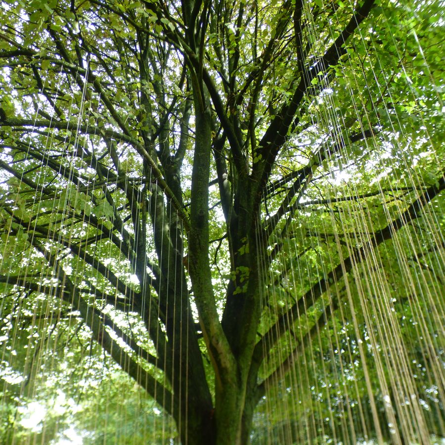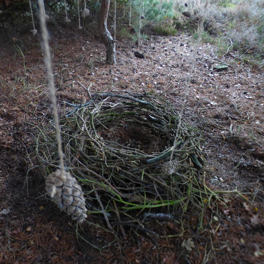 Meestal werk ik met draden, die ik naast elkaar hang. Hier mocht ik niets meenemen. Dus dat was zeer lastig. Toen vond ik de kastanjebladeren en maakte ik er bloemen mee.