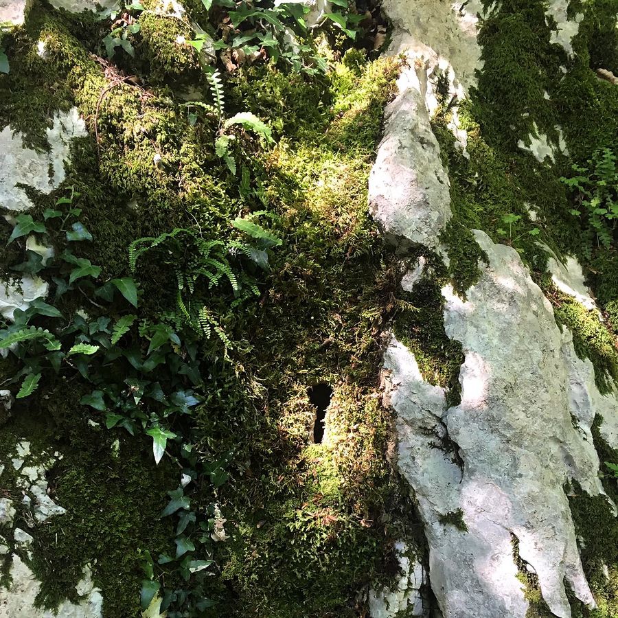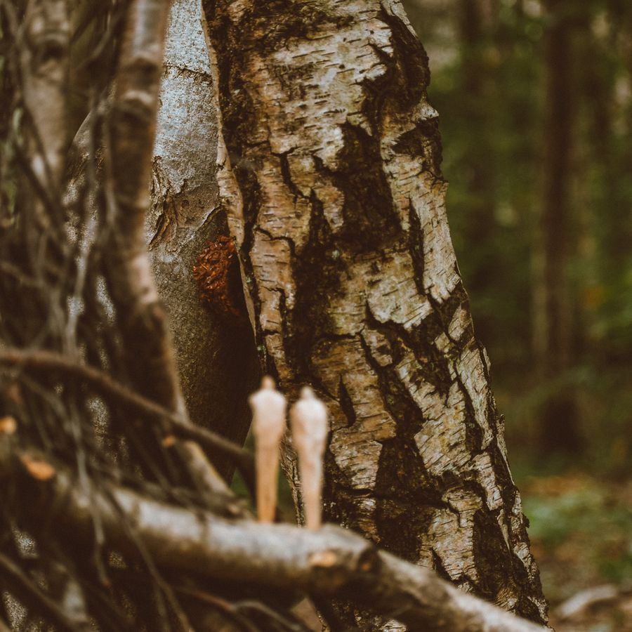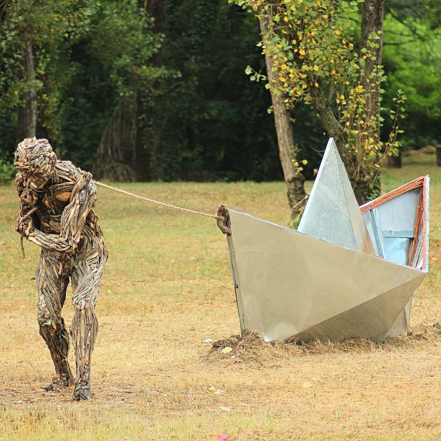 Twee kleine houten sculpturen van mensachtigen versterken deze evocatie. Ze herinneren ons eraan hoe klein we zijn in verhouding tot wat ons omringt, maar ook dat wij deel zijn van de natuur.