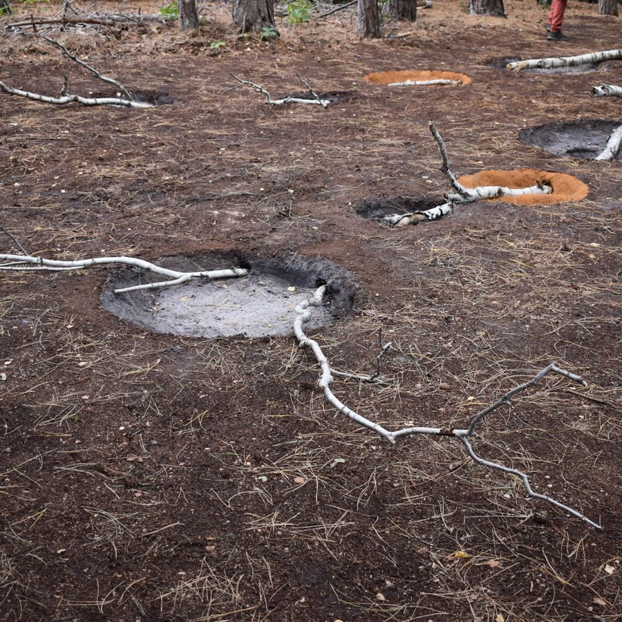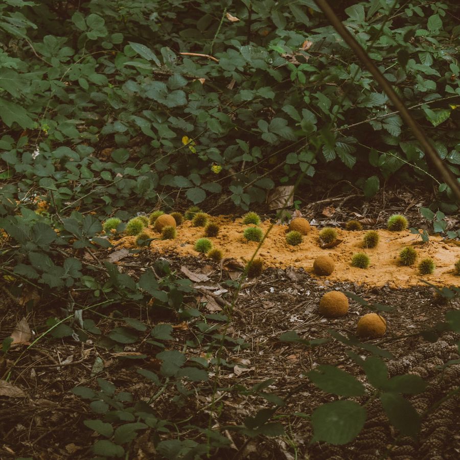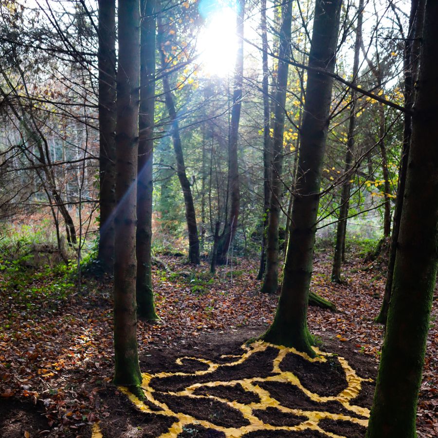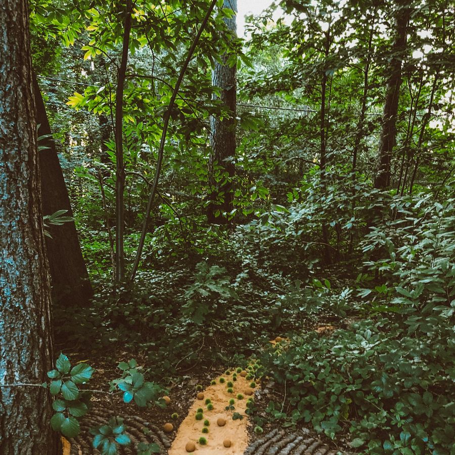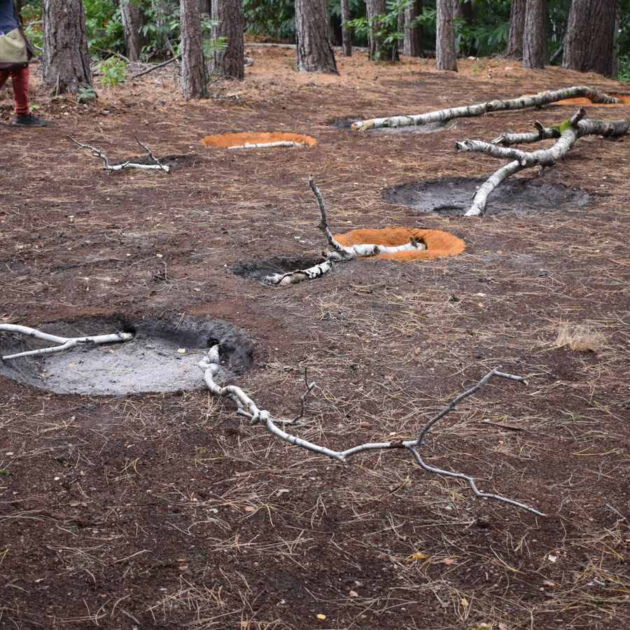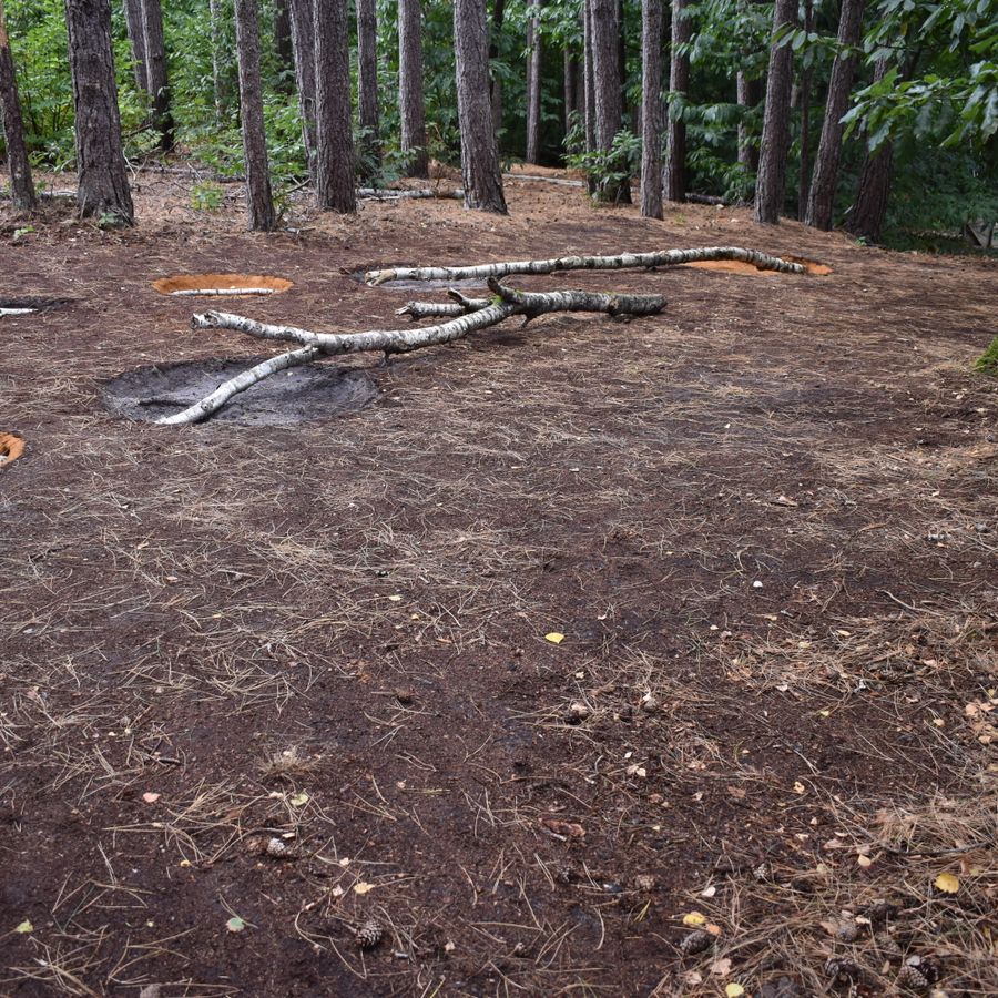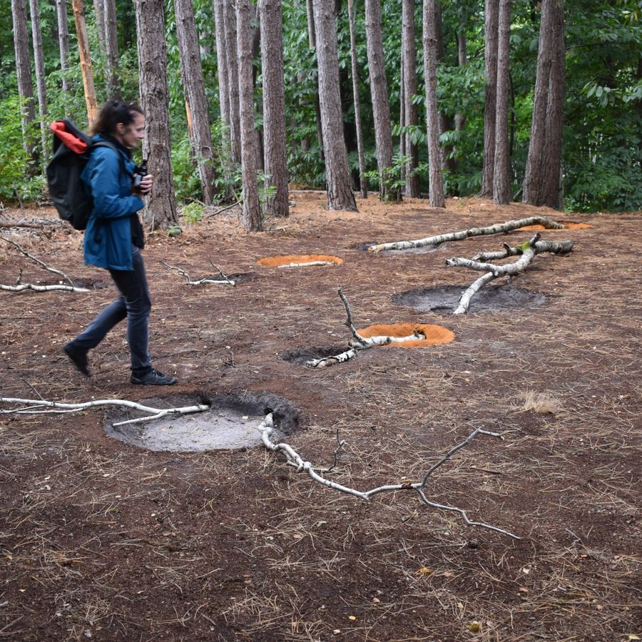 Ik ben gefascineerd door hoe de dennenbomen hun schaduw werpen op het werk, dat bestaat uit geometrische elementen zoals ingeboogde cirkels, rechte lijnen van boomstammen die door de grond steken, en contrasterende kleuren. Ook het idee van een drempel inspireerde me—een liminale ruimte waar naaldbomen en loofbomen elkaar ontmoeten. Zo ontstaat een plek waar twee werelden van het bos samenkomen.