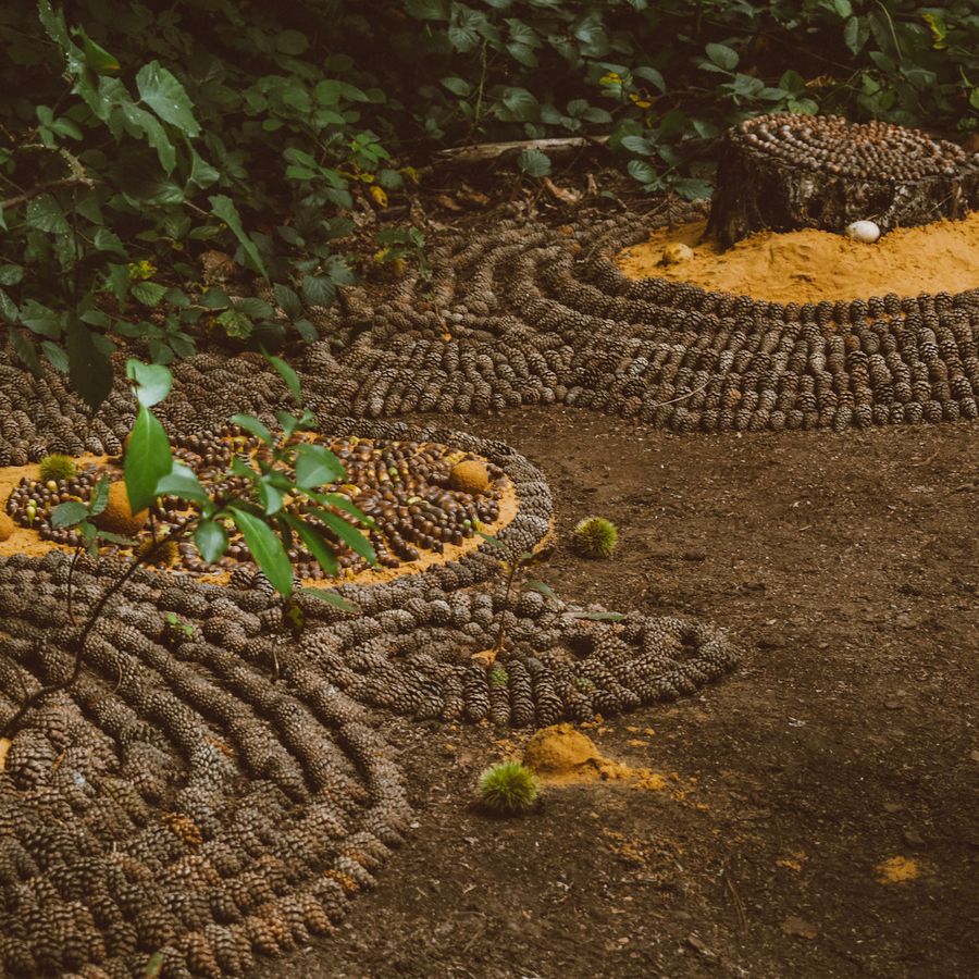 Tijdens het creëren kwamen slakken, spinnen, mieren, vogels en zelfs een kleine slang langs. Ze bewogen door het werk, bouwden webben en observeerden in stilte. Hun aanwezigheid versterkte het gevoel van verbondenheid met de omgeving.
