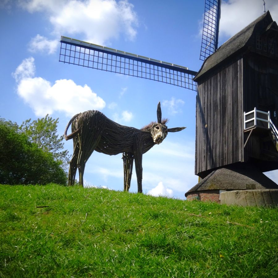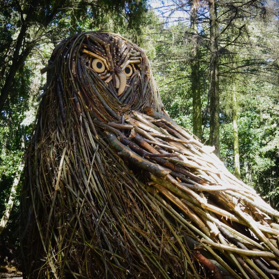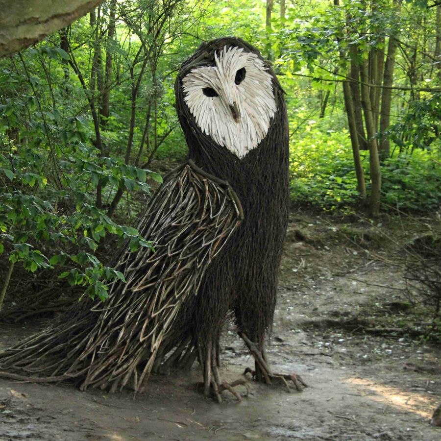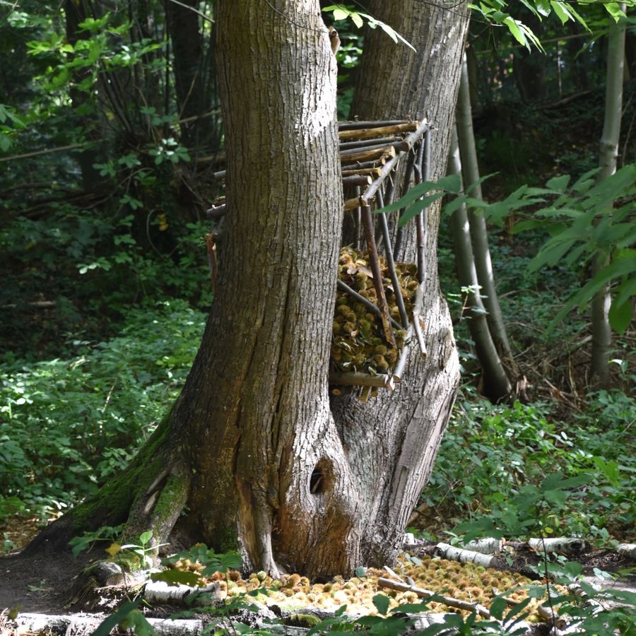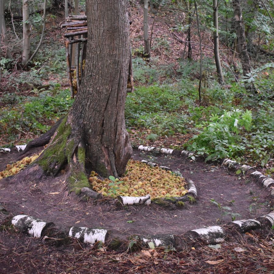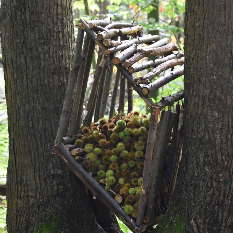 Ik maakte een doos van takken, opgehangen tussen twee bomen en gevuld met kastanjebolsters. Ze probeert de bolsters vast te houden, maar ze stromen over en vallen op de grond. Daarmee verbeeld ik de spanning tussen vasthouden en loslaten. Het is een primitieve mand, fragiel en tijdelijk, die herinnert aan de eeuwenoude herfsttraditie van oogsten, weven, verzamelen en delen.
