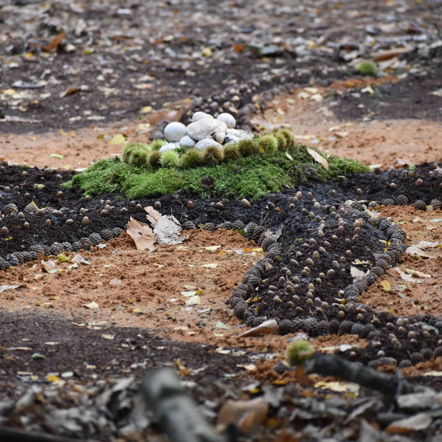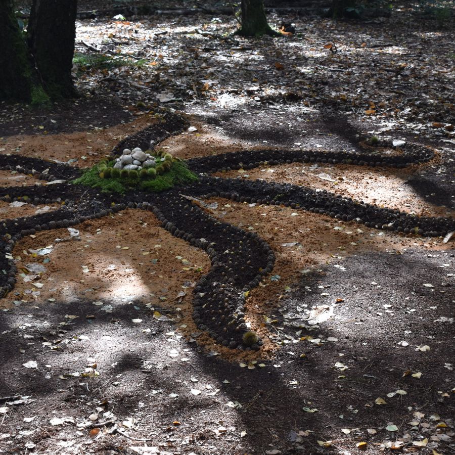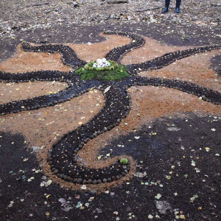 Bij mijn eerste bezoek aan de locatie werd ik onmiddellijk aangetrokken tot een boom met een dubbele stam. Hij leek als een bewaker te waken over mijn werk. Naast deze boom maakte ik een zeester met zeven armen in plaats van zes, omdat zeven voor mij een magisch getal is.
